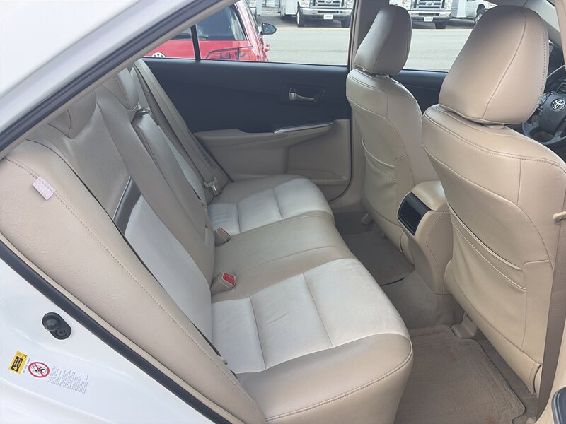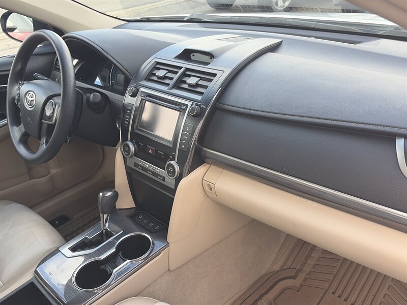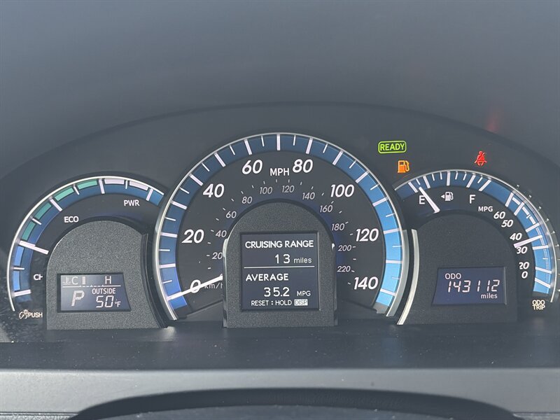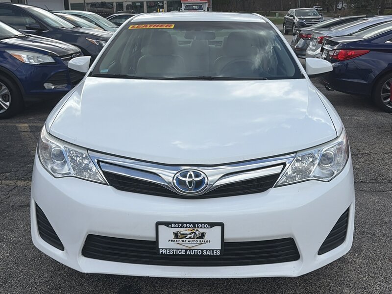 2013 Toyota Camry Hybrid LE — Super White exterior with Ivory leather interior. This Camry Hybrid combines Toyota’s hybrid drivetrain with a comfortable, well-appointed LE trim, delivering efficient day-to-day driving and a conservative, refined presence. The vehicle is in excellent overall condition, has a clean CARFAX report, and shows a single owner in its history.
