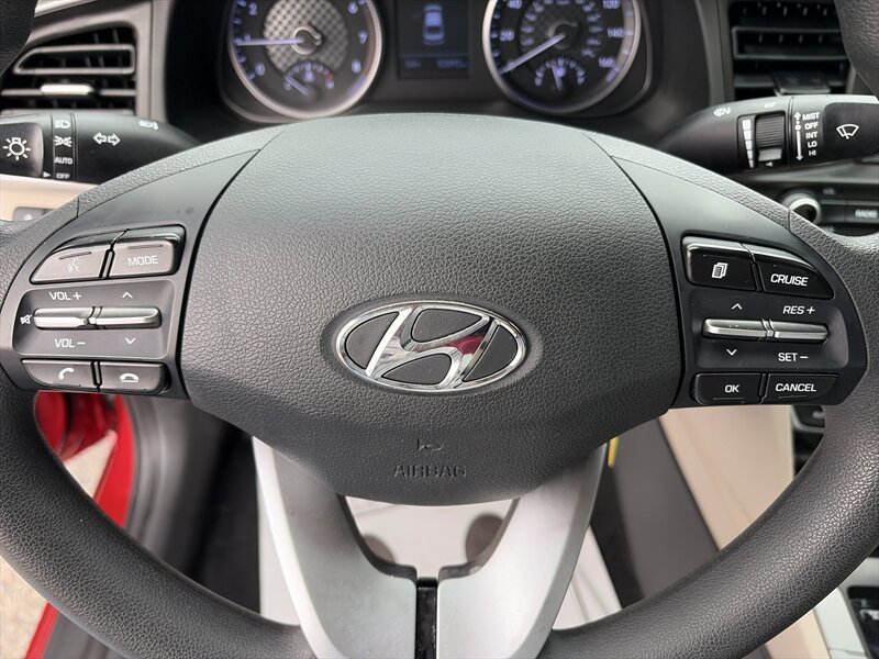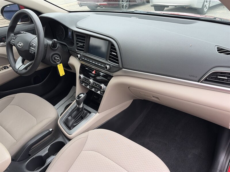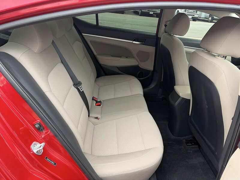 The Calypso Red paint remains bright and well-cared-for, contributing to a refreshed appearance that shows well in both close inspection and curb appeal. Exterior styling includes Hyundai’s signature front grille and clean body lines that give the ELANTRA a modern, aerodynamic profile. Factory exterior equipment typically found on the SEL trim includes 16-inch alloy wheels, body-color exterior trim, halogen headlights complemented by LED daytime running lights, heated power side mirrors, and an integrated rear trunk spoiler for a subtly sporty accent. The panels, glass, and trim are in excellent condition with no notable blemishes or signs of neglect.